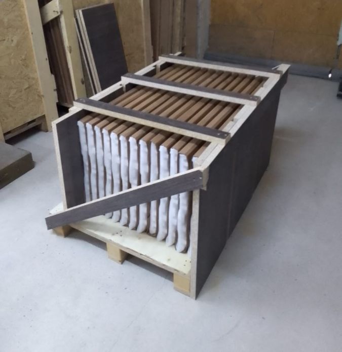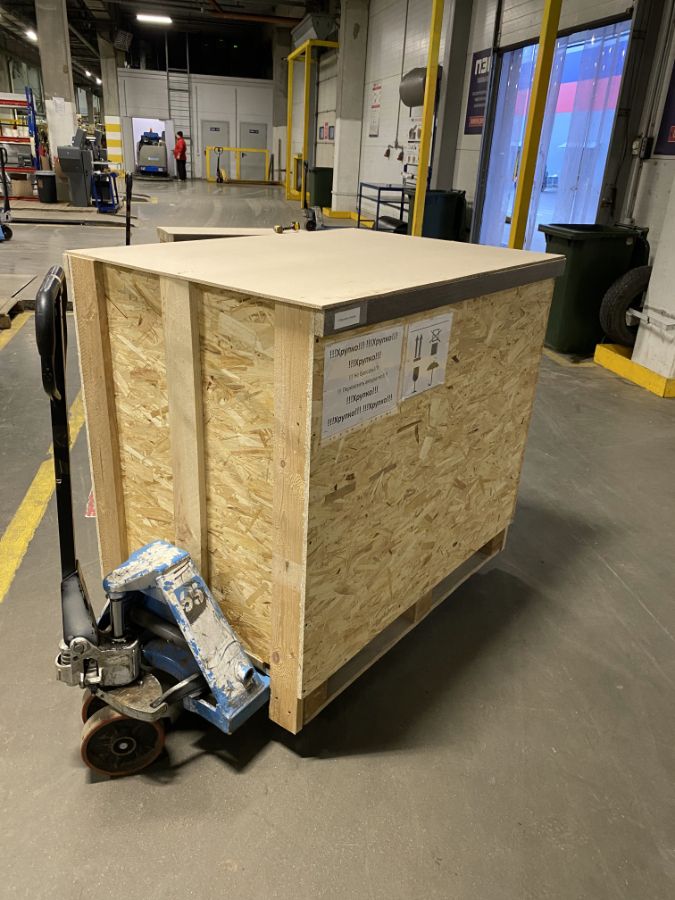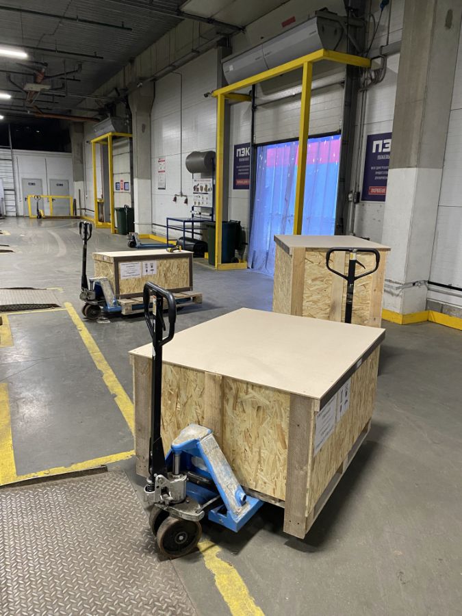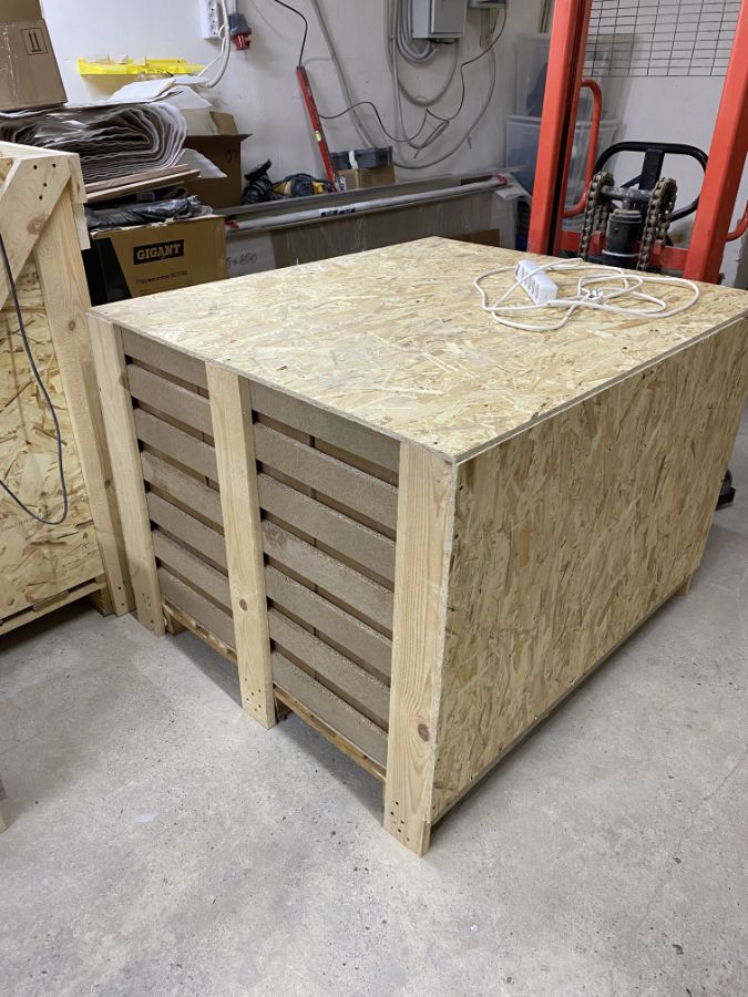 Некоторая наша продукция является габаритной и имеет длину больше стандартного европалетта - то есть длиннее чем 1,2 метра. На фото пример жесткой упаковки, которую мы используем для перевозки изделий длиной 2,2 метра - изготовленный деревянный ящик, выставленный на паллеты.
