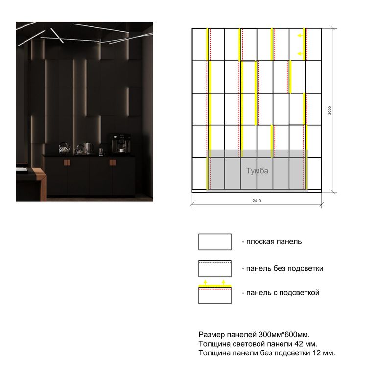 Панно состоит из двух панелей, которые можно по-разному комбинировать, при этом световая панель может быть выполнена без светового элемента.