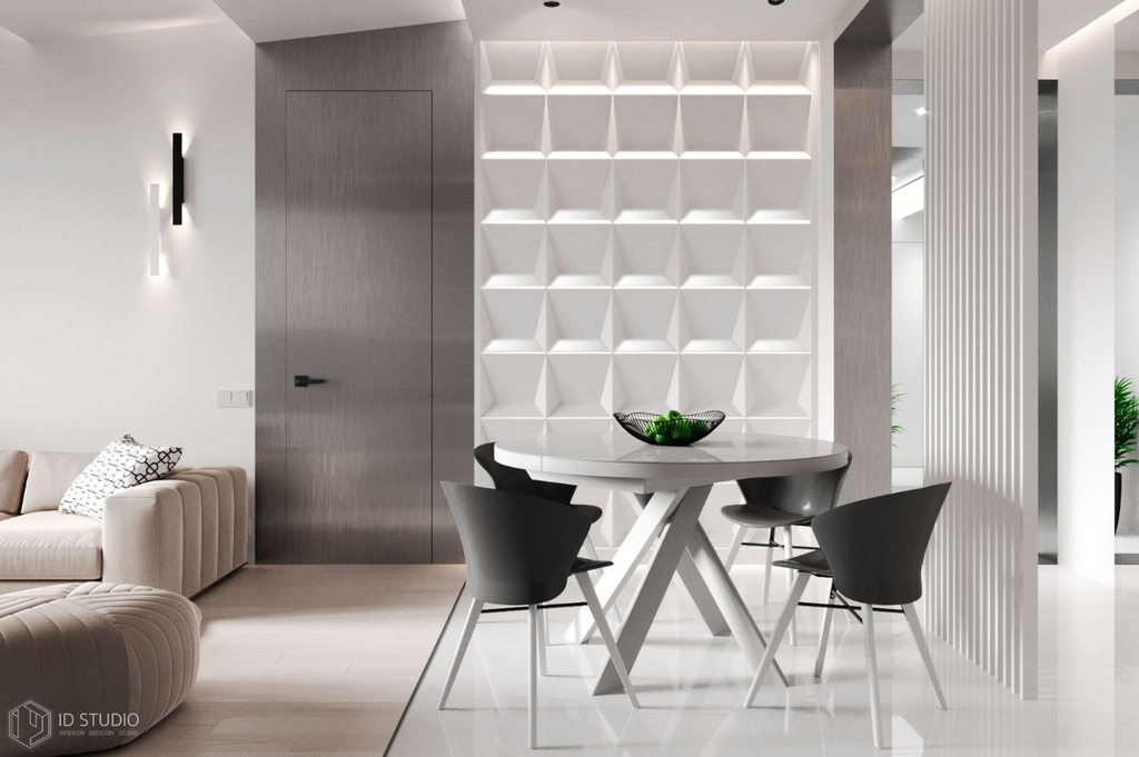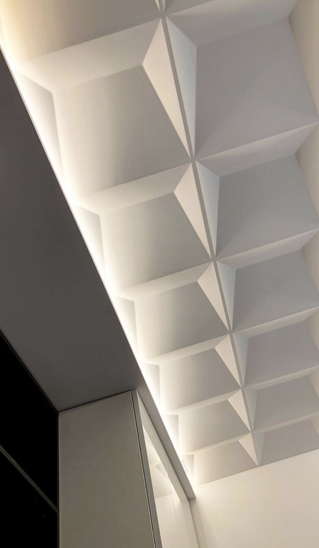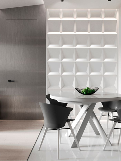 Панели из проекта дизайн-студии "Interior Decision Studio". Для развития индустриальной темы дизайнеры студии "Interior Decision Studio" использовали гипсовые 3D-панели в стиле популярного советского промышленного забора ПО-2. Форму квадратных модулей классической плиты ПО-2 изменили и переработали, сделали ее заглубленной и более выразительной для жилого пространства.