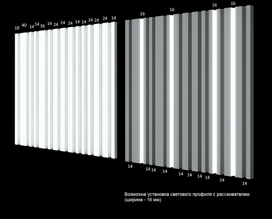 Возможна установка светового профиля с рассеивателем шириной 16 мм.